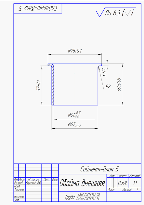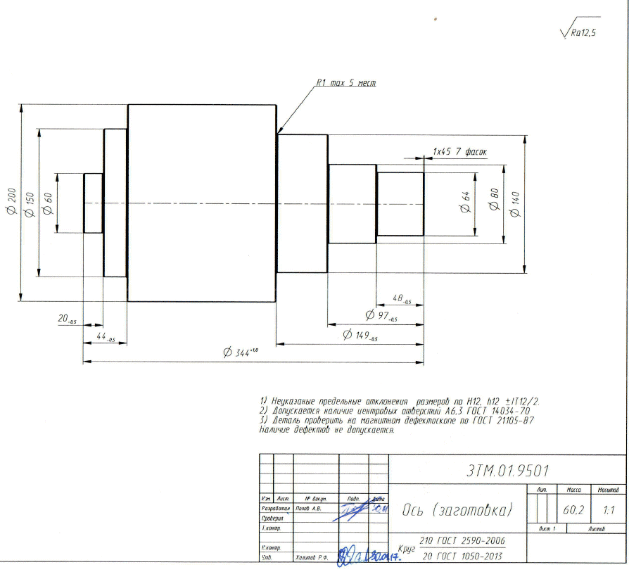 Дет. 26060-К2 Ниппель удлинительный. Заготовка КРУГ 80-В1 ГОСТ 2590-2006/10Х17Н13М2Т-б-Т ГОСТ 5949-75 , L=612 мм. Расточить ф 62+0,5, шероховатость 6,3, прямолинейность 0,5. Без обработки по наружному диаметру – 2 шт.